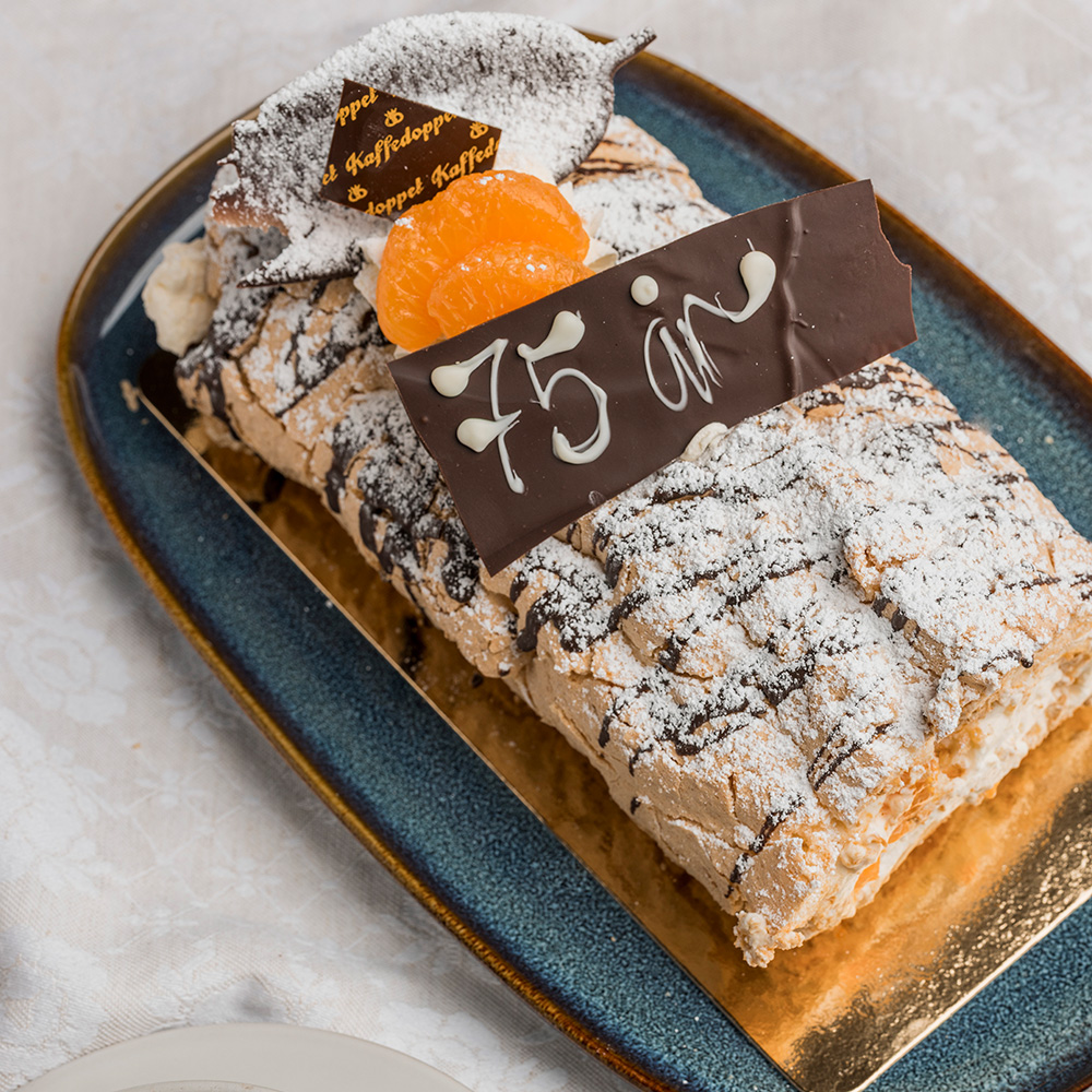 Nötfri mjuk maräng, grädde, mandariner, ripplad choklad dekoration efter säsong.